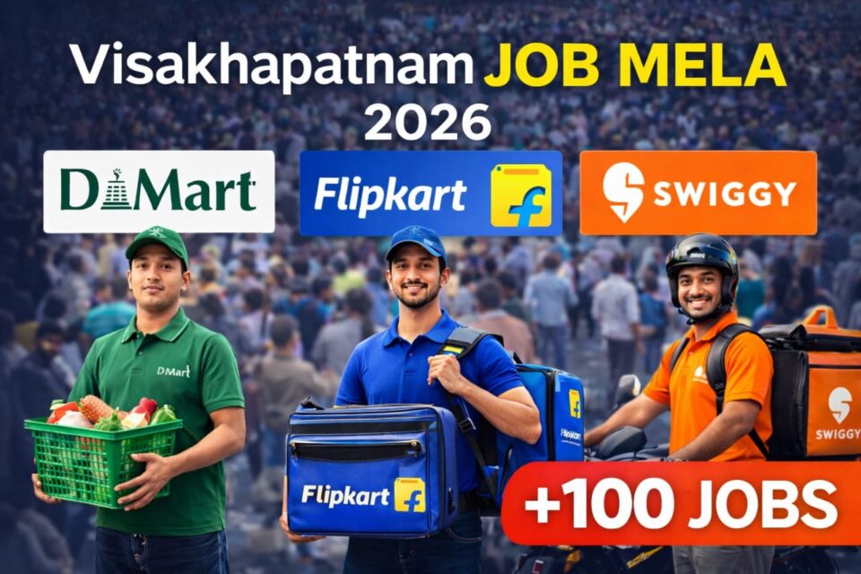 విశాఖపట్నం జాబ్ మేళా 2026 – పూర్తి వివరాలు: ఆంధ్రప్రదేశ్ ప్రభుత్వ Employment & Training Department ఆధ్వర్యంలో విశాఖపట్నంలో భారీ Job Mela నిర్వహించనున్నారు. ఈ జాబ్ మేళాలో ప్రముఖ కంపెనీలు D Mart, Flipkart, Innov Source Pvt Ltd, Swiggy పాల్గొని వివిధ పోస్టులకు అభ్యర్థులను ఎంపిక చేయనున్నారు.