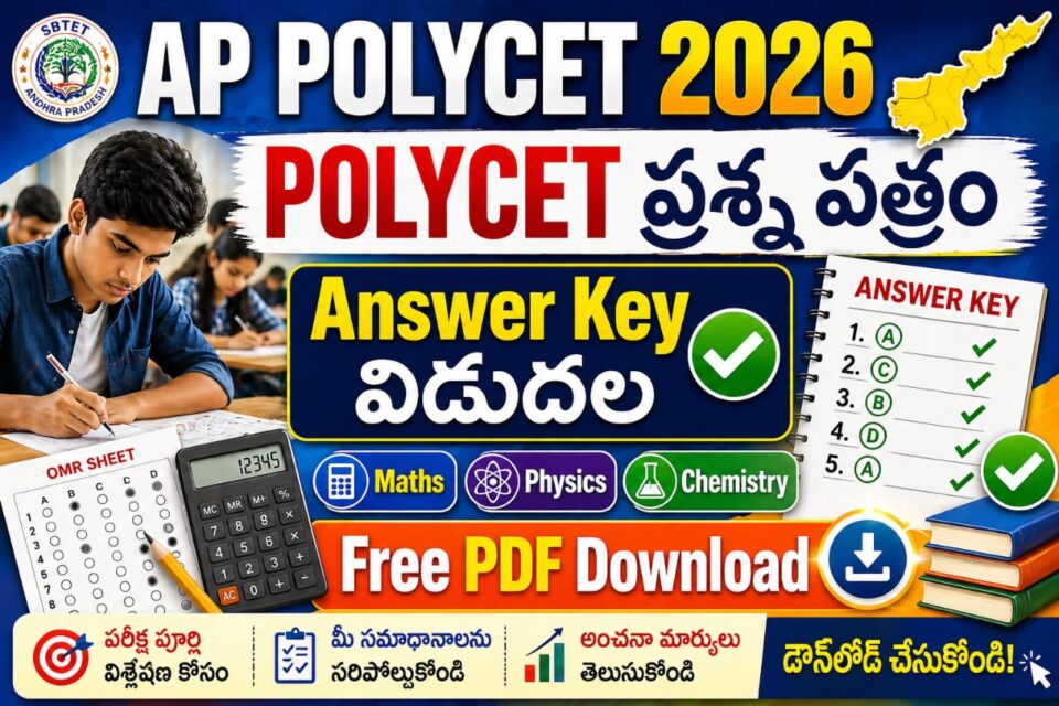 ఆంధ్రప్రదేశ్ పాలిటెక్నిక్ ప్రవేశ పరీక్ష అయిన AP POLYCET 2026 ఇటీవల విజయవంతంగా నిర్వహించబడింది. ఈ పరీక్షలో గణితం, ఫిజిక్స్, కెమిస్ట్రీ అంశాల నుండి మొత్తం ప్రశ్నలు అడిగారు. పరీక్ష పూర్తైన వెంటనే అభ్యర్థులు ప్రశ్న పత్రం మరియు అనధికారిక Answer Keys ఆధారంగా తమ సమాధానాలను సరిపోల్చుకుంటున్నారు. అధికారిక Answer Key ను State Board of Technical Education and Training Andhra Pradesh త్వరలో విడుదల చేయనుంది. ఈ Question Paper & Key ద్వారా విద్యార్థులు తమ అంచనా మార్కులను లెక్కించి ఫలితాలపై ముందుగానే అవగాహన పొందవచ్చు.